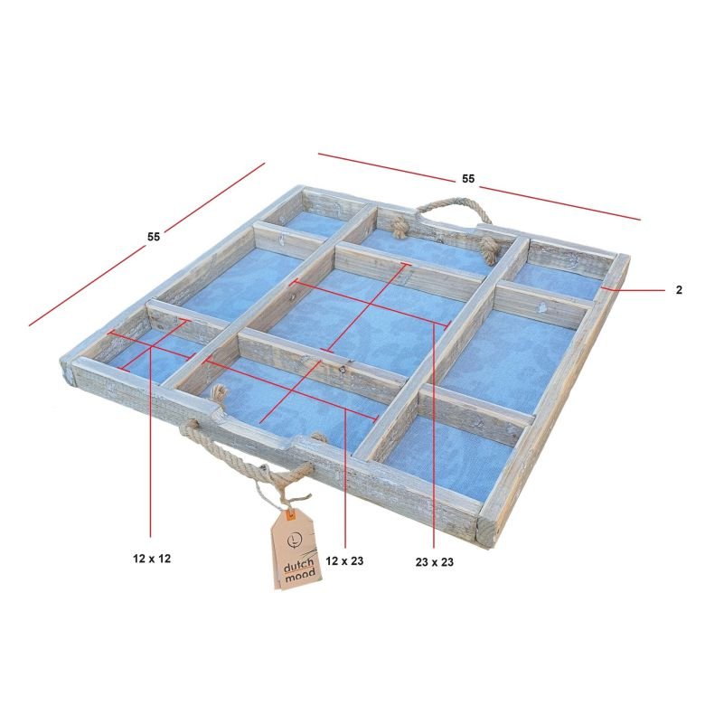 Hocker-trays zijn verkrijgbaar van 55 x 55 t/m 92 x 92 cm, dit model meet 55 x 55 cm.