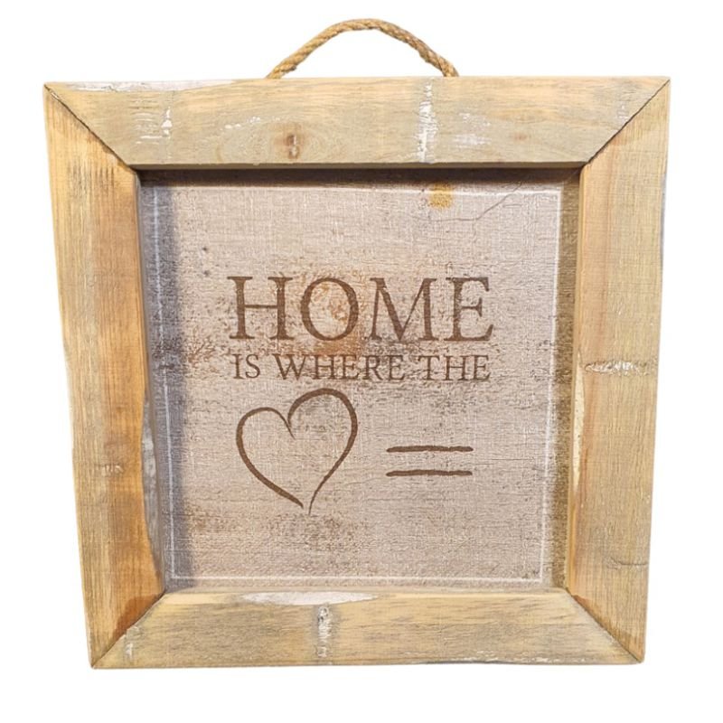 Een houten wandtegel met de spreuk “Home is where the…”, omlijst door een robuust houten frame.